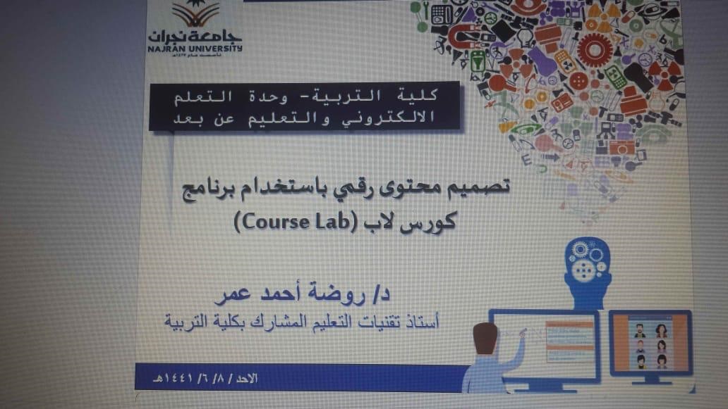 نظمت لجنة التعلم الالكتروني بكلية التربية - شطر الطالبات- اليوم الأحد 8/6 /1441 هـ دورة تدريبية بعنوان (تصميم محتوى رقمي باستخدام course lab ) لعضوات هيئة التدريس بكلية التربية، تحت اشراف أ. سلمى اليامي، وهدفت الدورة التي قدمتها د. روضة عمر-عضو هيئة التدريس بكلية التربية- إلى تعريف العضوات بأهمية استخدام برنامج course lab وكيفية تصميم محتوى رقمي تفاعلي، كما تطرقت مقدمة الدورة إلى عدة محاور منها: مميزات برنامج كورس لاب، متطلبات تشغيل برنامج الكورس لاب، انشاء (محتوى) مقرر تعليمي باستخدام الكورس لاب، نشر المحتوى الذي تم تصميمه .