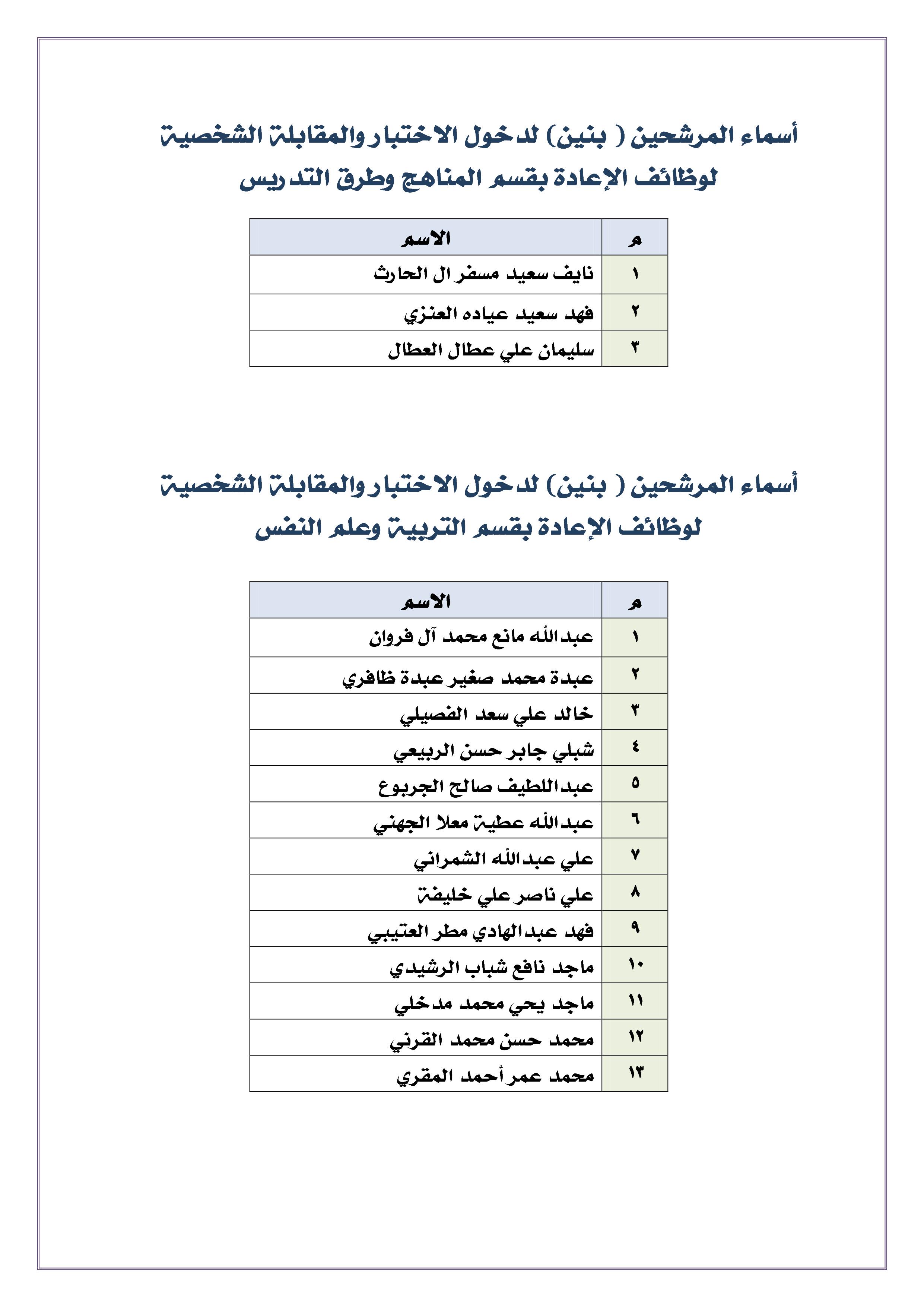 أسماء المرشحين (بنين) لقسمي المناهج وطرق التدريس / والتربية وعلم النفس