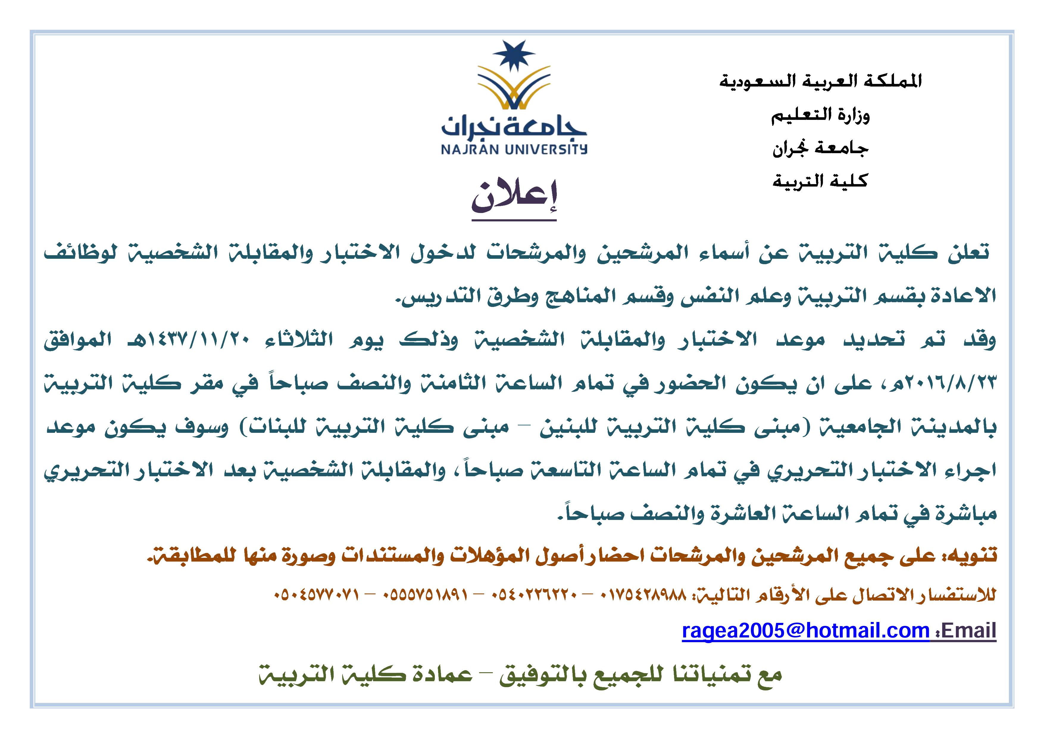 null كلية التربية تعلن عن إجراء المقابلة الشخصية والاختبار للمتقدمين للإعادة