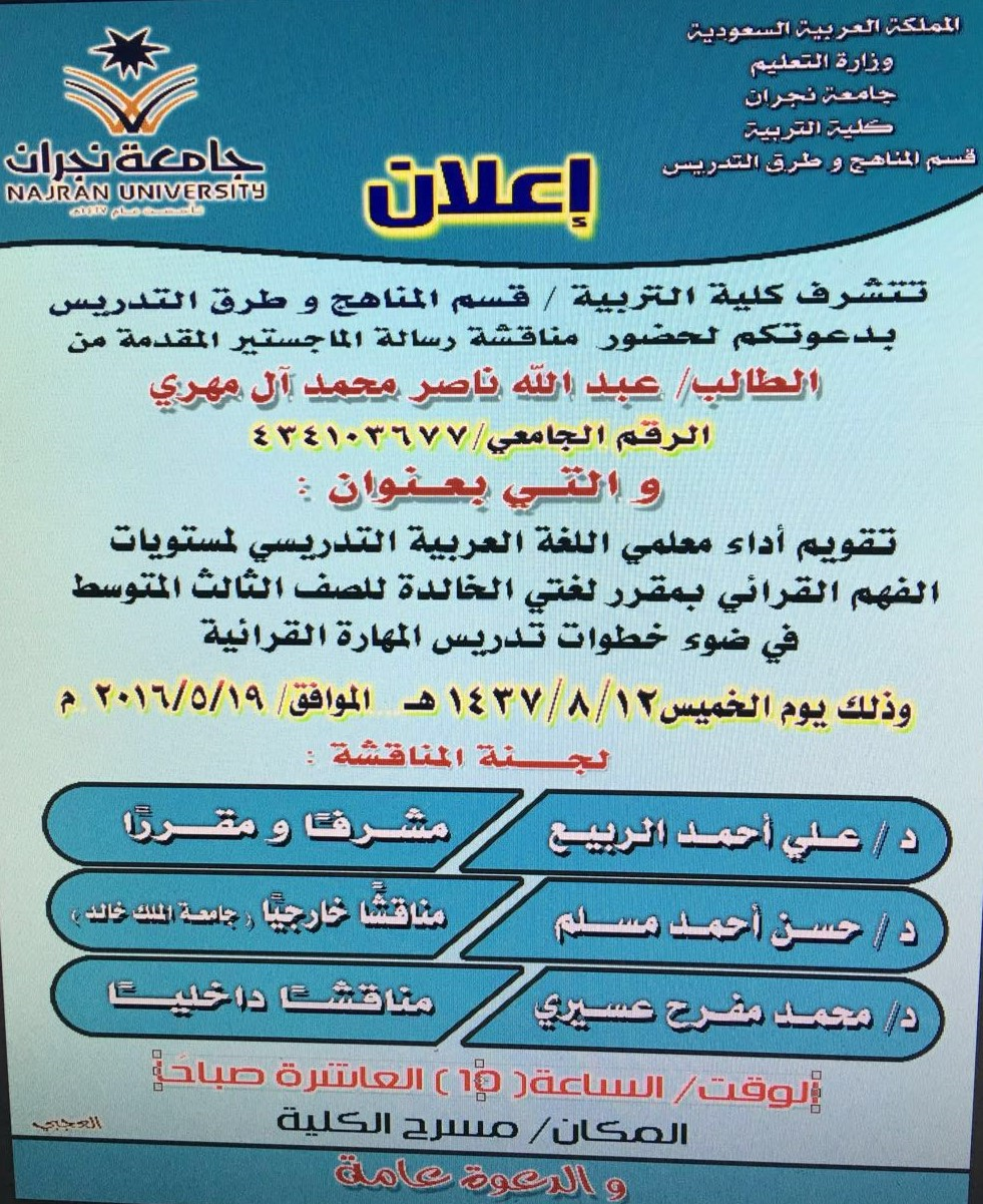 null مناقشة رسالة الماجستير gلطالب/عبدالله ناصر ال مهري